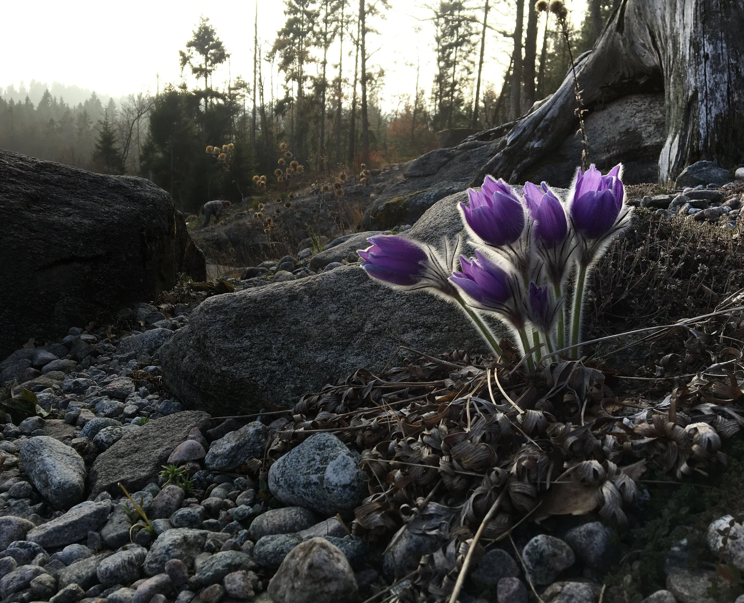 Pulsatilla grandis blooming on a cold April day in Peter Korn’s garden, Eskilsby, Sweden, 2017 (author photograph)