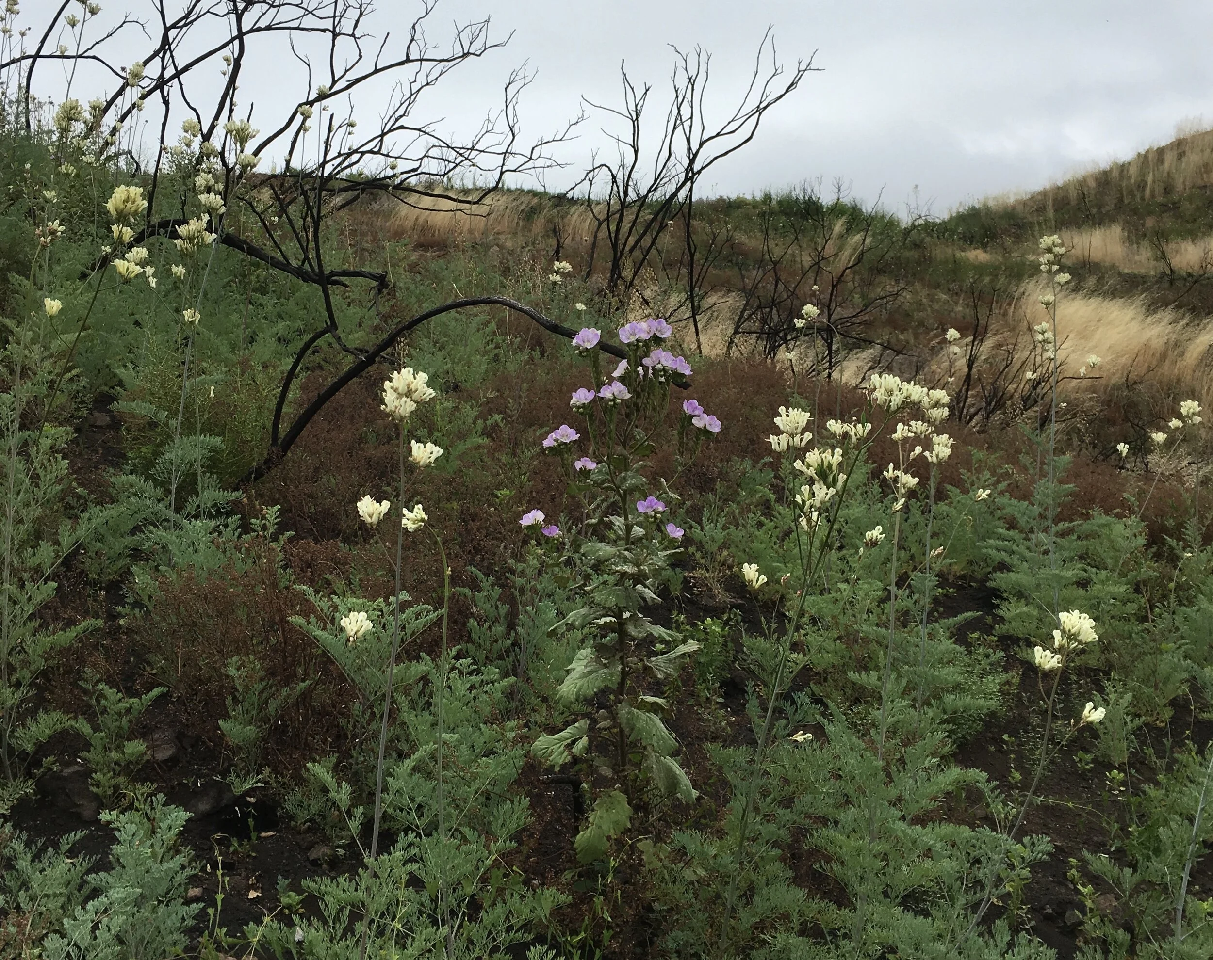 Ehrendorferia ochroleuca and Phacelia grandiflora in Agoura Hills, CA, post-Woolsey Fire, June 2019 (author photograph)