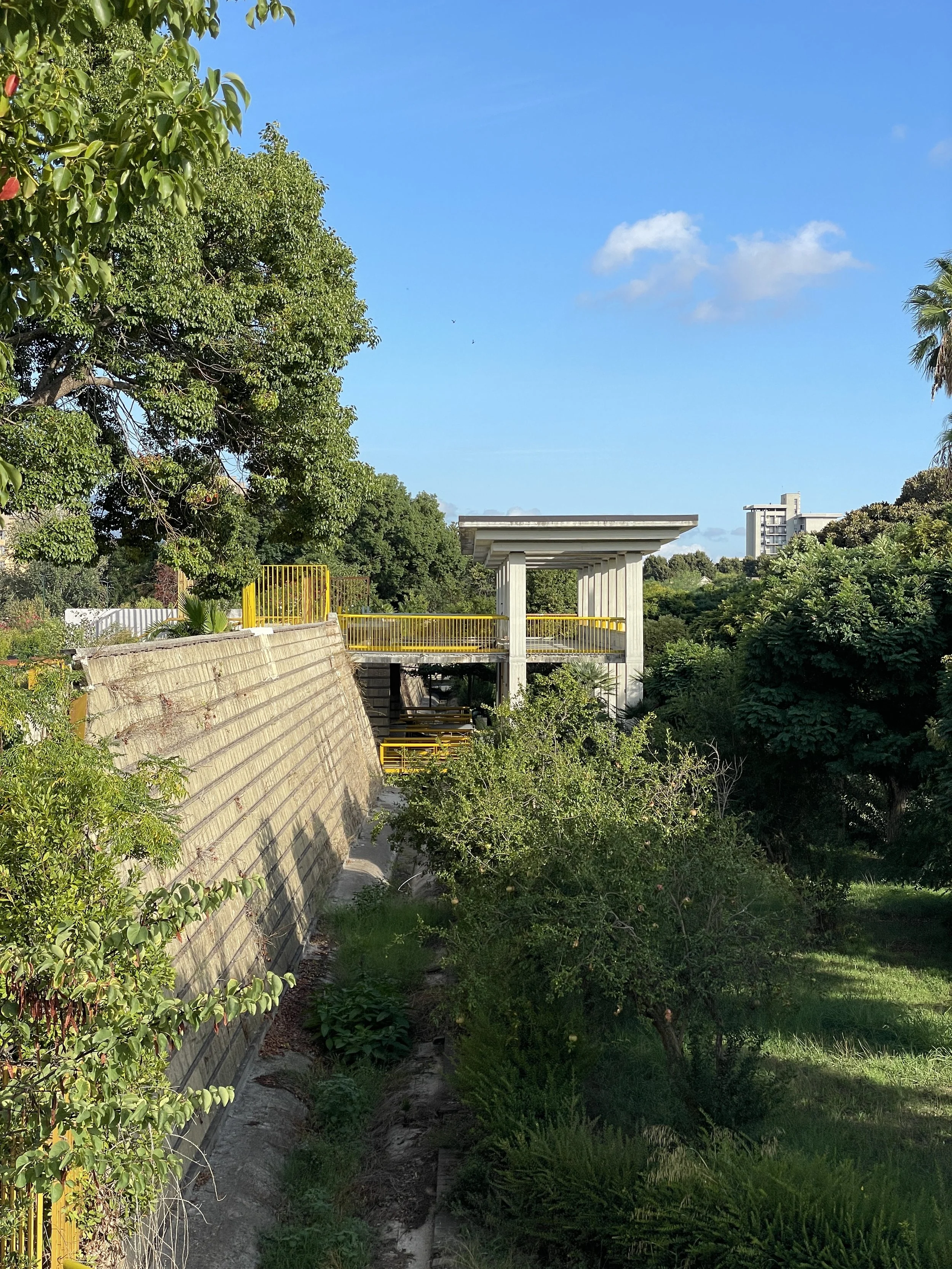Walking through the gate, I entered onto a narrow, sloped ramp descending into the center of the small park. Two terraced pergolas descended with me, parallel to the symmetrical ramped paths. In the remaining spaces left by the cuts of the paths were planting beds filled with white-flowered Oleander (Nerium oleander) and spindly Olive trees (Olea europaea). There were dozens of children running around, parents and elderly people sitting on benches watching them and chatting, and a group of teens huddled morosely on top of a split staircase leading to a shuttered section of the park. I was amazed at the liveliness of the space, especially for how compact it was.