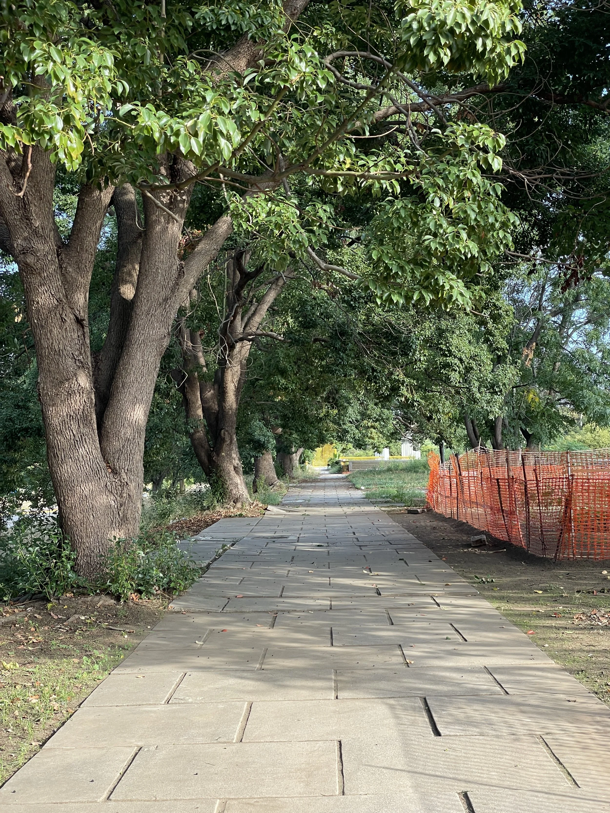 The northern walkway is coupled with a long line of mature Camphor trees (Cinnamomum camphora). The lush, chartreuse green of the leaves, the dappled sunlight, and the remnants of the yellow painted metal of the bridge railings, all work together to create a feeling of brightness to this edge of the park. The large tree canopies also create a feeling of enclosure and sheltering, which dynamically contrasts with the expansive views of the park one looks out to over the parapet railing.